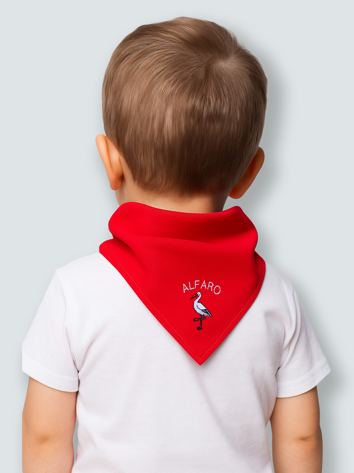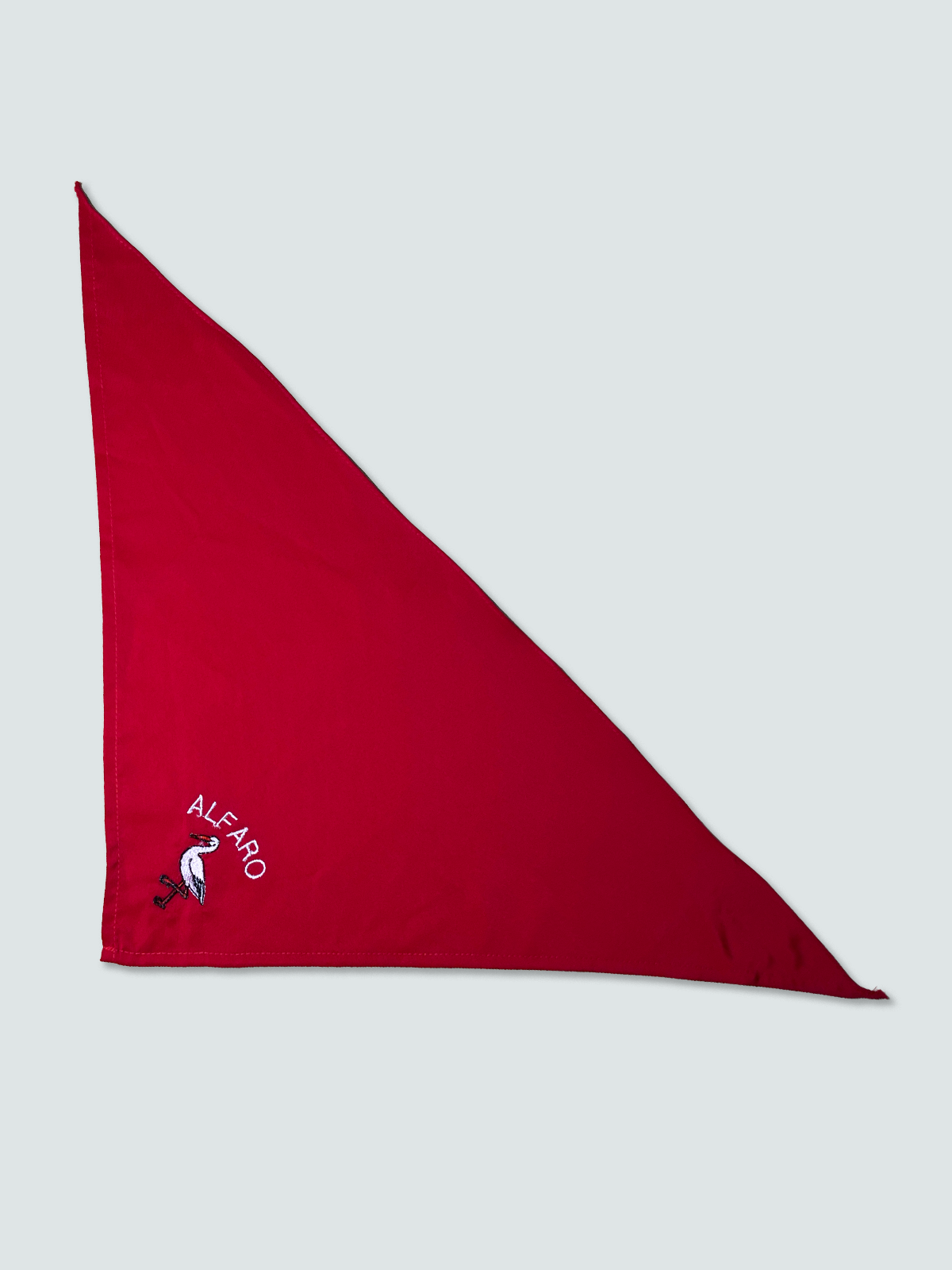 Pañuelo de crespón rojo, en forma de pico, con delicado bordado de la cigüeña de Alfaro. Suave y ligero, ideal para bebés.